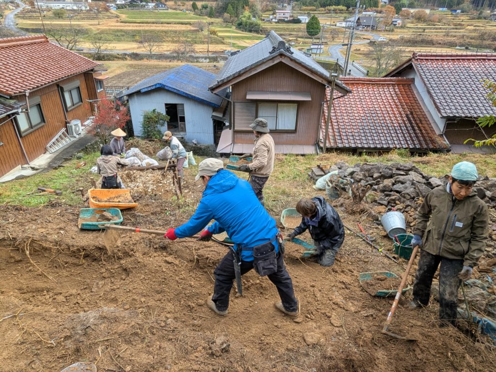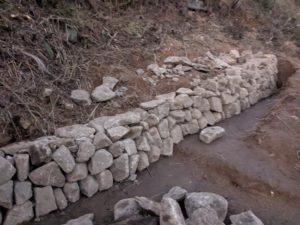主にはこれ以上土手が崩れないように、場を整備しつつ丁寧に石垣を積みました。